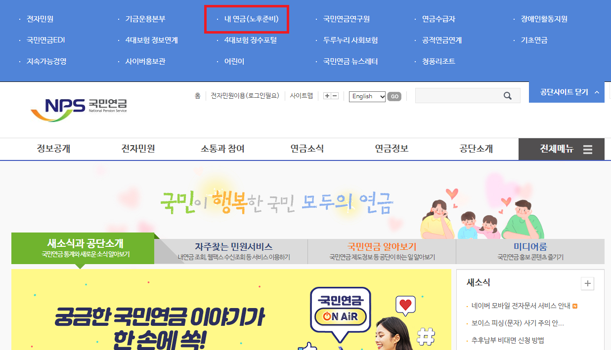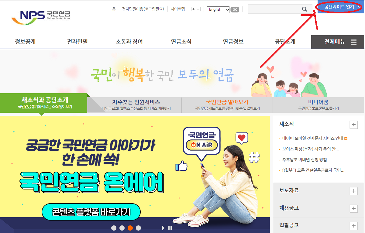 검색창에 '국민연금'을 검색한 후에 '페이지 우측 상단'에 위치한 '공단사이트 열기'버튼을 눌러준다.