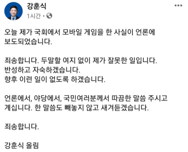 더불어민주당 강훈식의원은 자신이 국감장에서 모바일 게임을 한 것에 대해 논란이 일자, 자신의 페이스북에 "오늘 제가 국회에서 모바일 게임을 한 사실이 언론에 보도됐다"라고 말하며 "죄송하다. 두말 할 여지 없이 제가 잘못한 일"이라고 적으며 사과문을 올렸다.