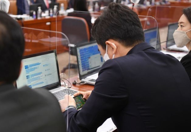 더불어민주당 강훈식 의원이 국감장에서 모바일 게임을 하는 장면을 취재진 카메라가 포착한 것이다.