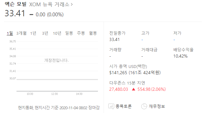 엑슨모빌도 코로나 충격 이후에 33달러로 하락해있는 상태다. 매출도 역시 2019년에 떨어지기 시작했으며 2019년에 영업이익도 반토막이 난 상태다.