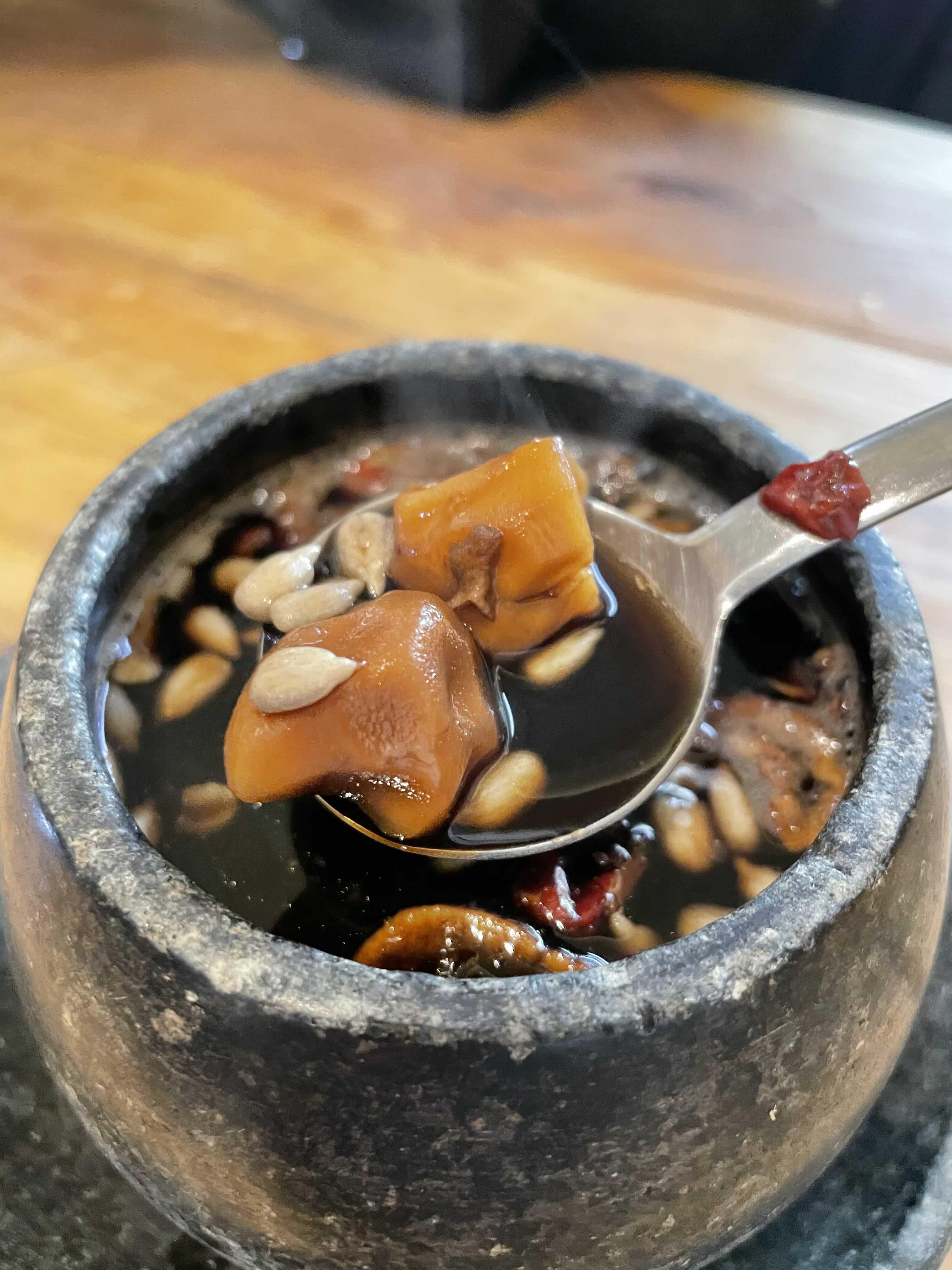 이른바 '겉바속쫀'에 달달하면서 호박맛 꿀을 찍어서 입안에 넣으면 쌉싸름한 쌍화차와 조화를 이룬다.