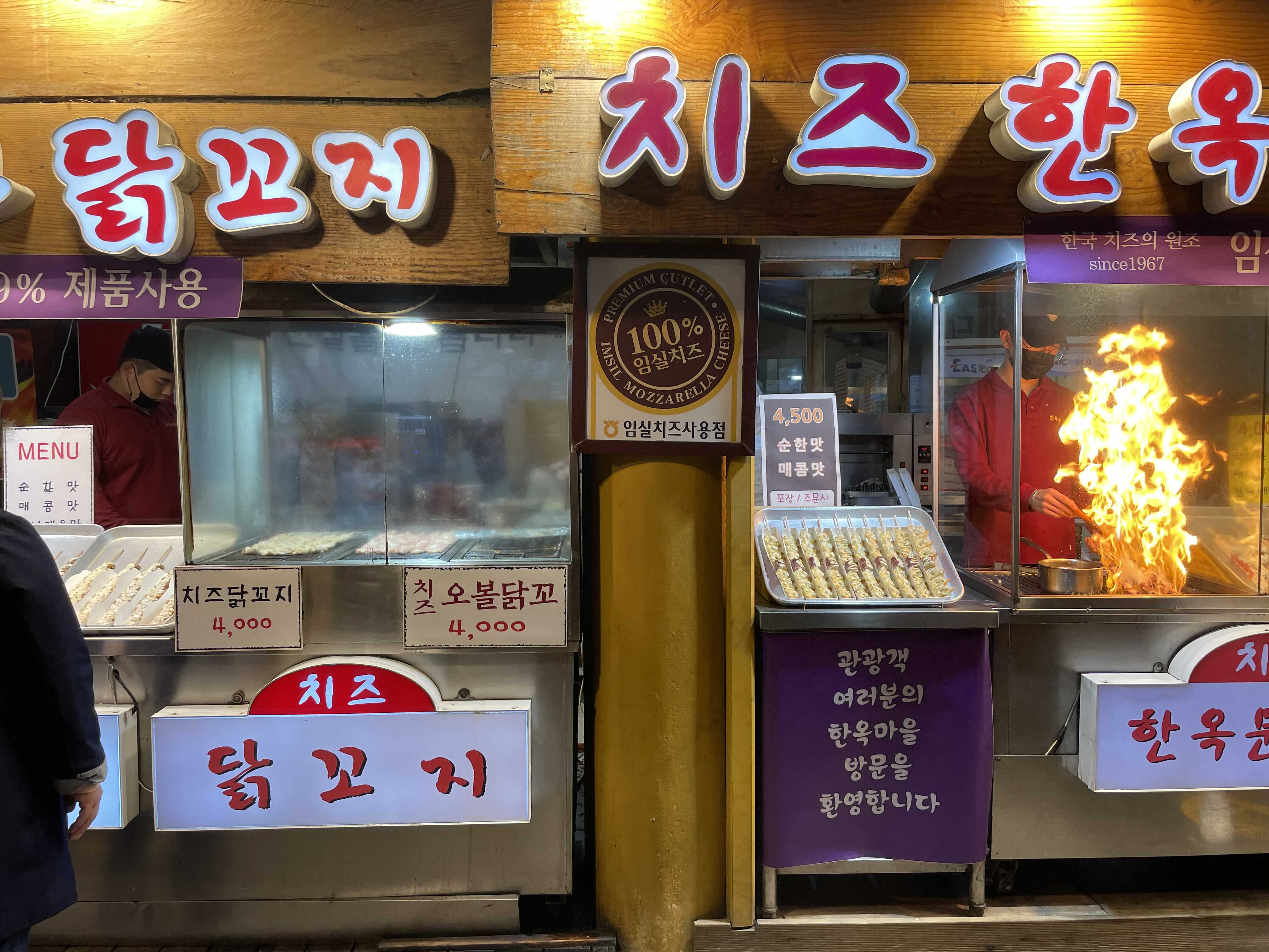 한옥문꼬지는 줄이 너무 길게 늘어서있어서 포기하고 우리는 치즈닭꼬지를 선택했다.