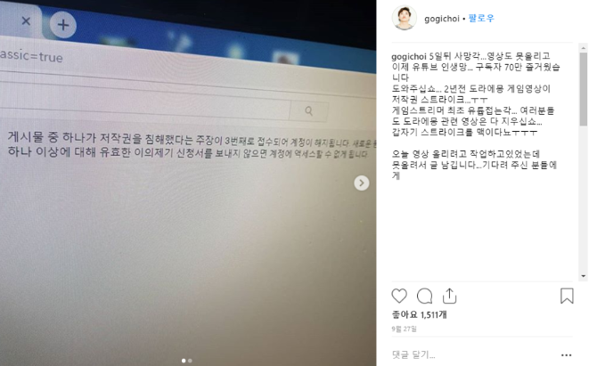 당시 최고기의 유튜브 계정은 구독자수 약 70만명으로 당시 유튜버 TOP100안에도 들었던 큰 채널이었다.
