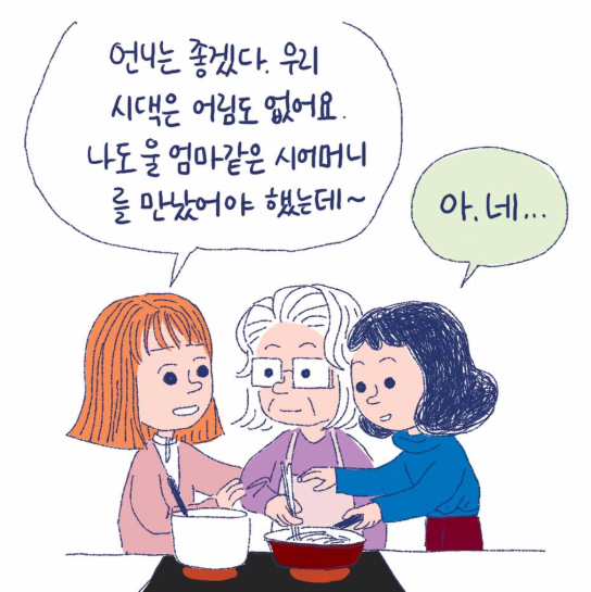 종국에는 며느리가 힘들어하는 '며느라기'를 대신해서 '행복한 한 가정'을 만드는 방법을 고민하라는 뜻에서 작가가 열린 결말로 마무리를 짓지 않았을까 하는 혼자만의 생각을 해본다.