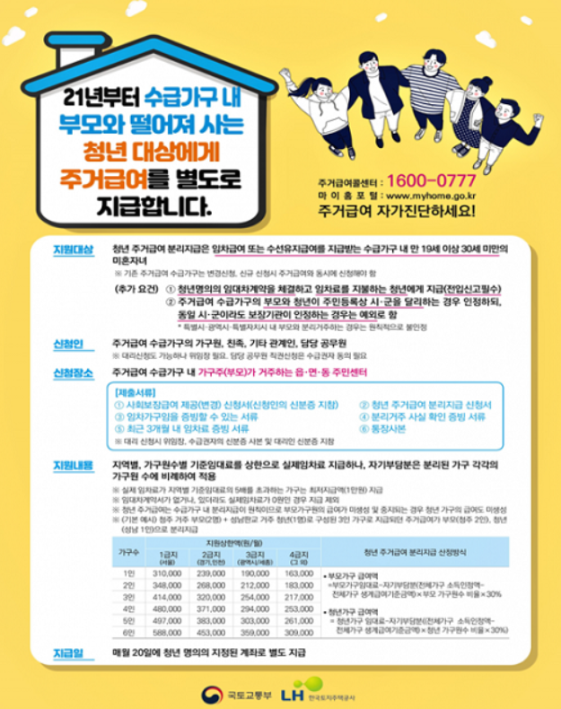 '청년 주거급여 분리지급'은 하나의 보장가구 형태는 그대로 유지하면서 임차급여의 산정방식을 변경해서 저소득층 청년에게 주거급여를 별도로 지급하는 내용이다.
