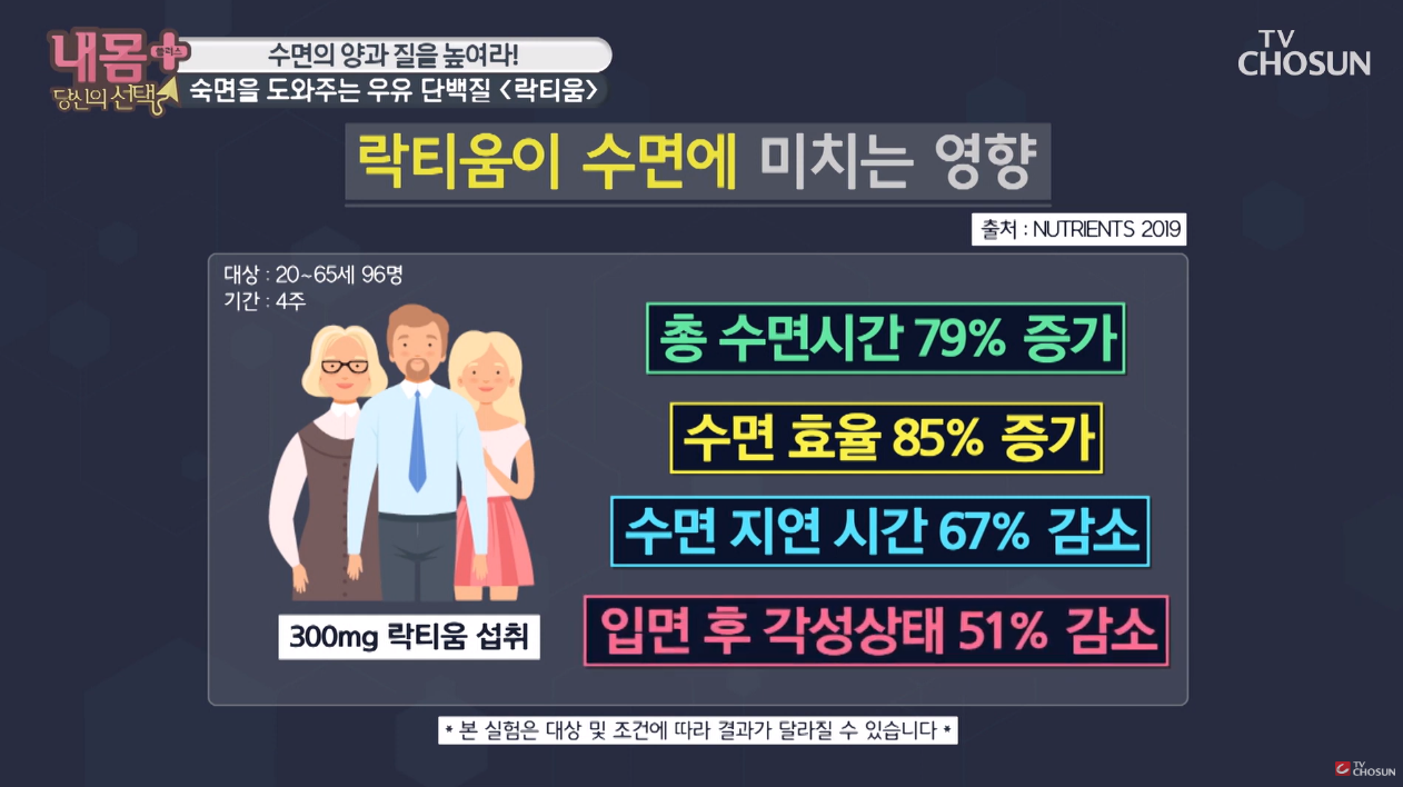 실제로 20세에서 65세 지원자 96명을 대상으로 시험군과 대조군으로 나눈 후 락티움을 300mg씩 4주간 섭취하게 했는데 그 결과 대조군에 비해서 락티움 섭취그룹은 총 수면시간이 79%나 증가했으며, 수면의 효율은 85% 증가했다.