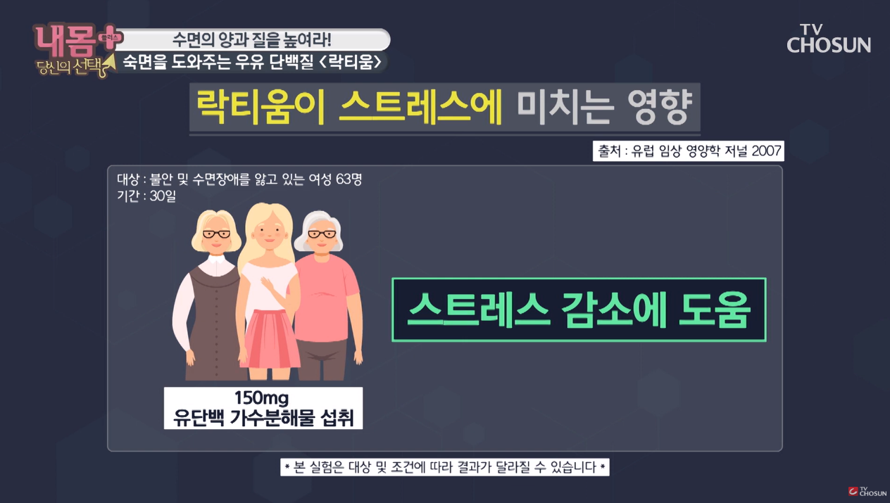 뿐만 아니라 불면증을 없애기 위해서 스트레스를 해소하는 것도 매우 중요한데, 실제로 불안과 수면장애를 동시에 앓고 있는 여성 63명에게 30일동안 유단백 가수분해물을 150mg씩 섭취하게 한 결과, 스트레스의 감소에 도움이 된 것으로 나타났다고 한다.