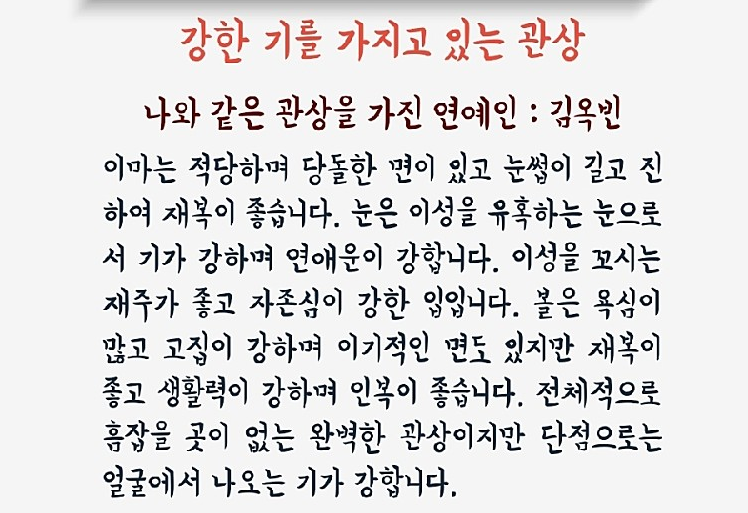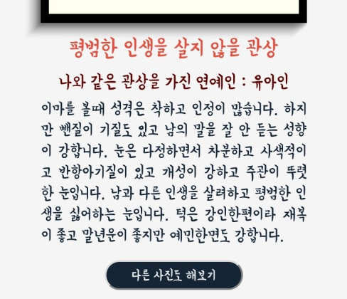 나와 같은 관상을 가진 연예인으로 여러명이 나오는데, 안소희, 김옥빈, 유아인, 수지 등 많은 연예인들이 등장하니 그 결과가 궁금하다면 한번 확인해보는 것도 재미있을 것이다.