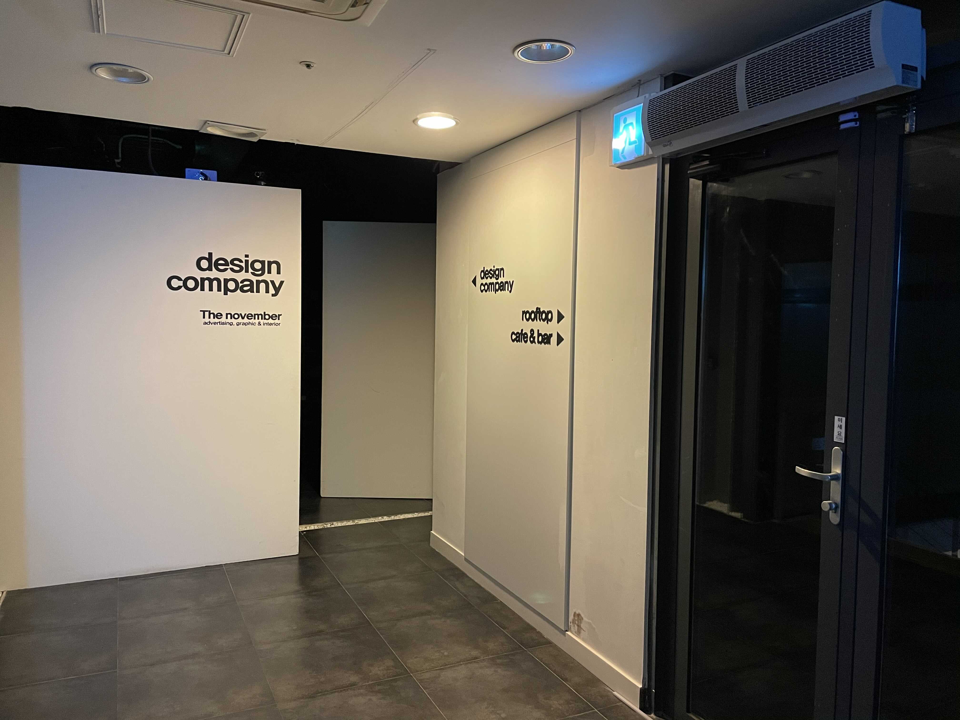 디자인컴퍼니'더노벰버'라고 쓰여있고, 오피스와 루프탑으로 가는 출입구도 보인다.