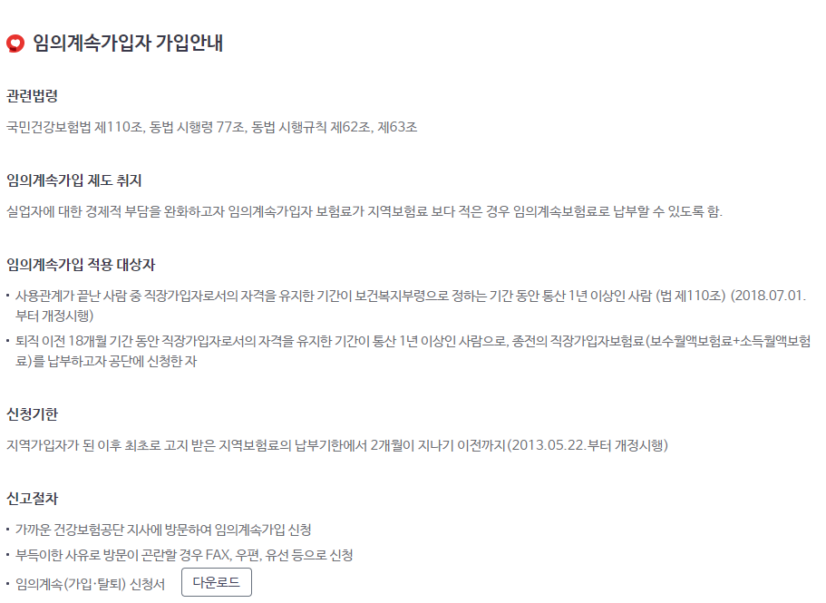 임의계속가입제도는 퇴직 후 지역가입자로 전환하면서 건강보험료 부담이 급격히 늘어난 퇴직자의 보험료 부담을 덜기 위한 제도이다.