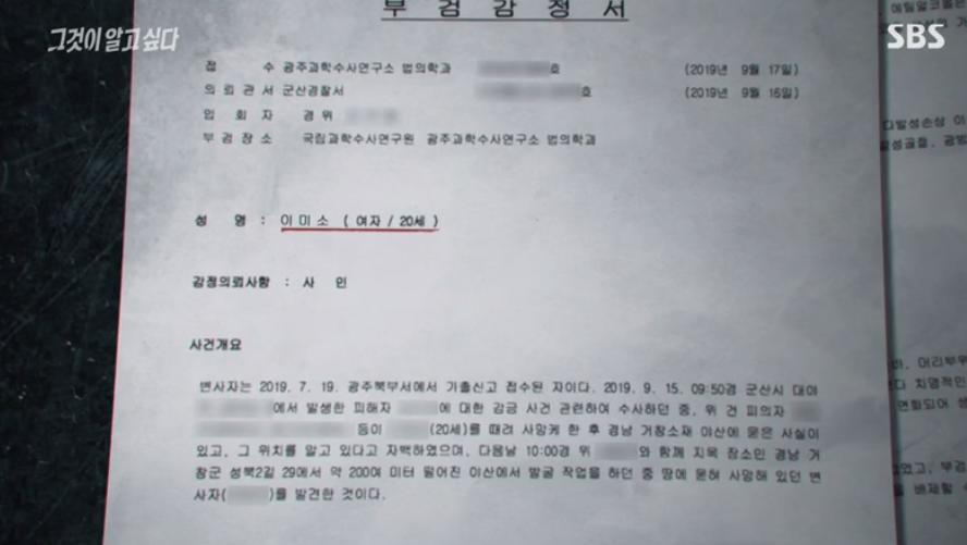 결국 끌려가는 동영상에 찍혔던 여자를 구출해낸 경찰에서는 해당 정보를 토대로 수사를 종결하지 않은채로 그녀를 납치했던 동거인들을 심문하게 되고, 경상남도 거창군의 야산에 그들이 묻은 시신을 발견하게 된다.