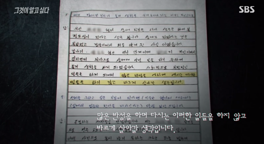 피해자에게 너무 미안해서 눈물을 흘리고 있다는 주범 장 씨의 편지였다. 주범 장 씨는 '살해'를 포함해서 감금과 폭행, 성매매 강요를 주도한 죄로 감옥에 잡혀있는데, '항소심'이라는 걸 진행중이라고 한다.(역시 인간이길 포기했다)