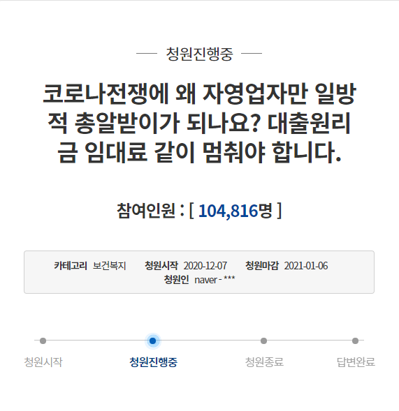한편 자영업자들의 힘들어하는 목소리도 여기저기서 나오고 있는데, 한 국민이 올린 청원에 많은 소상공인과 자영업자가 동의하며 힘을 얻고 있다.