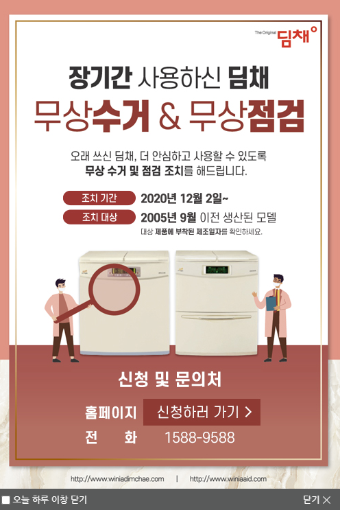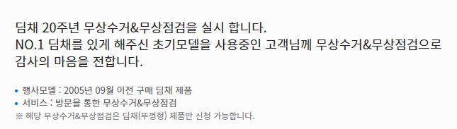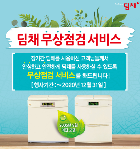 이 기간 안에 혜택을 적용받는 것이 무조건 좋기 때문에 위니아 딤채를 사용하고 있다면 반드시 무상점검과 노후제품 교체혜택을 받아보기 바란다.