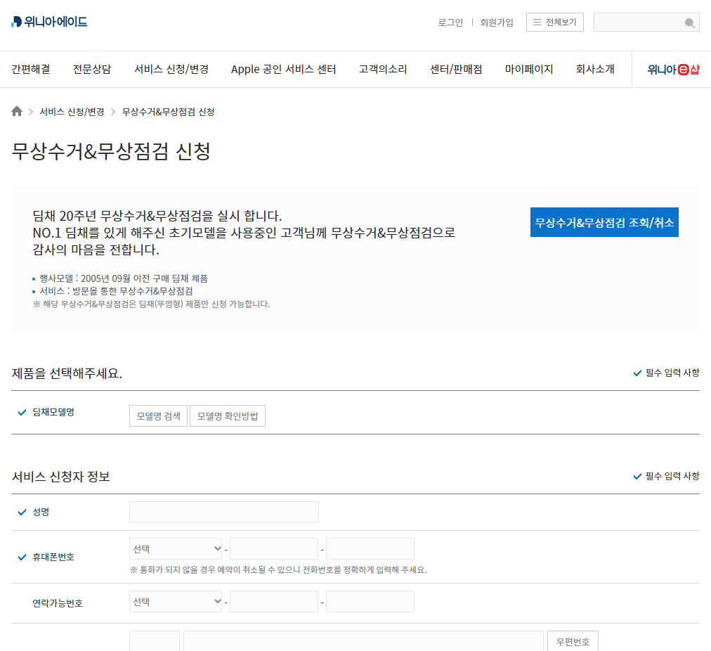 현재 위니아 딤채 홈페이지를 방문하면 팝업 안내가 떠있기 때문에 한번만 클릭하면 위니아 딤채 무상 리콜 접수 페이지로 이동이 가능하다.