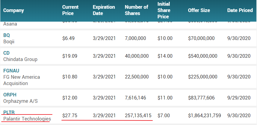 팔란티어의 락업해제일은 2021년 3월 29일이며 수량은 257,135,415 정도가 된다고 한다.