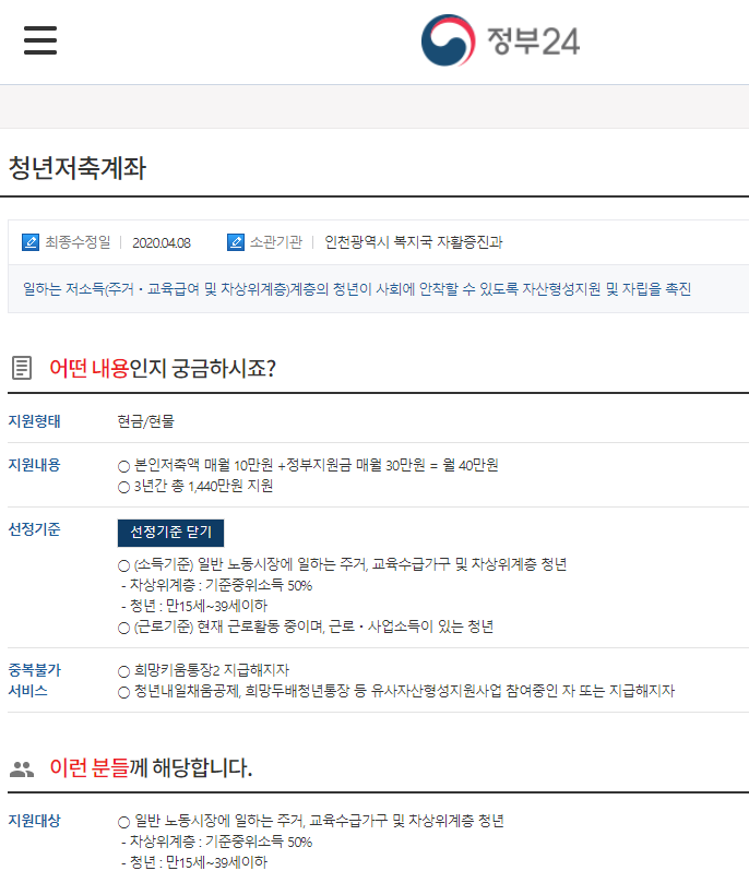 근로나 사업소득이 있는 저소득 청년(만15세~39세)을 대상으로 월 10만원을 저축하면 정부가 근로소득 장려금으로 월 30만원을 지원해주는 파격적인 적금제도이다.
