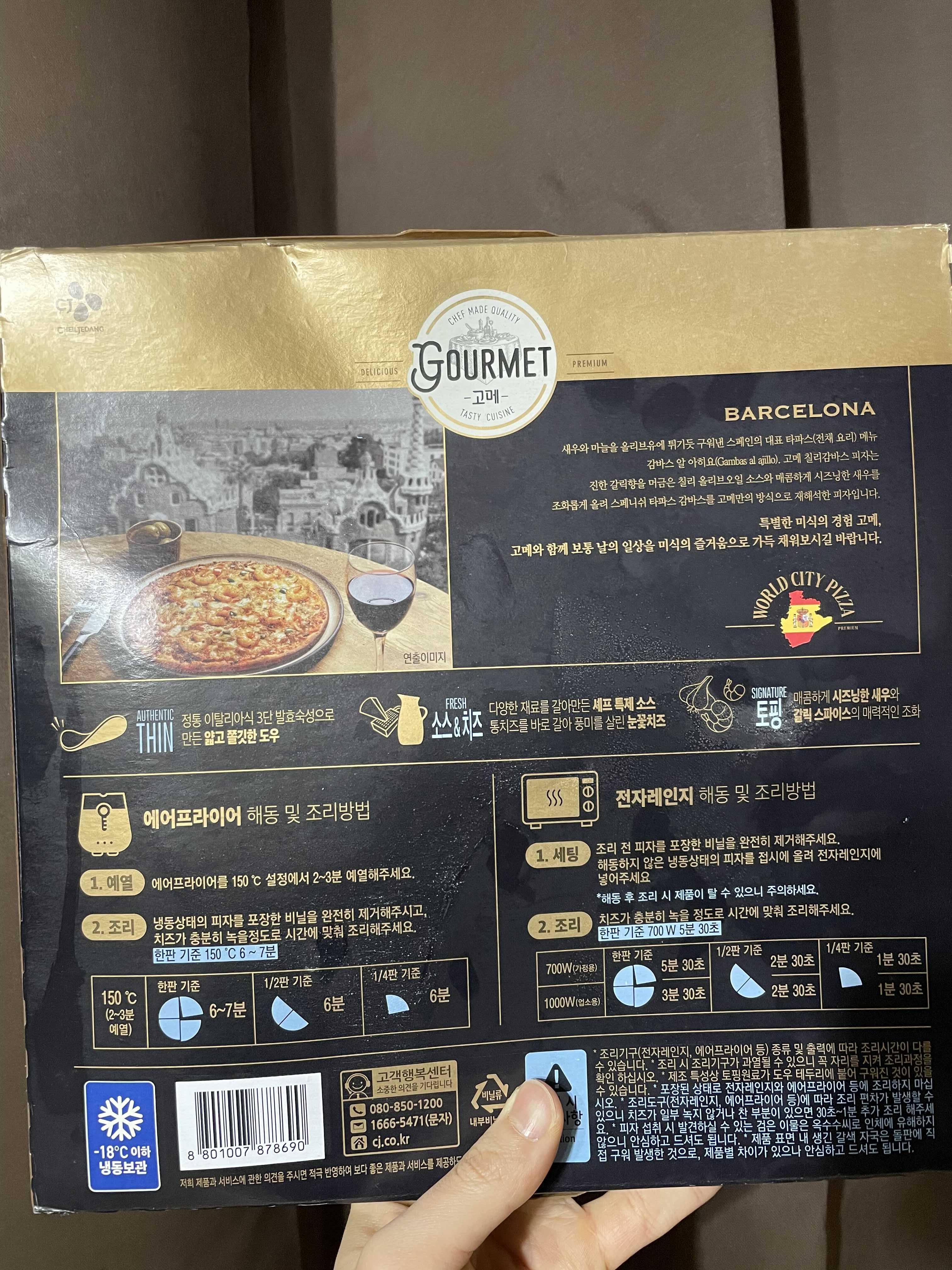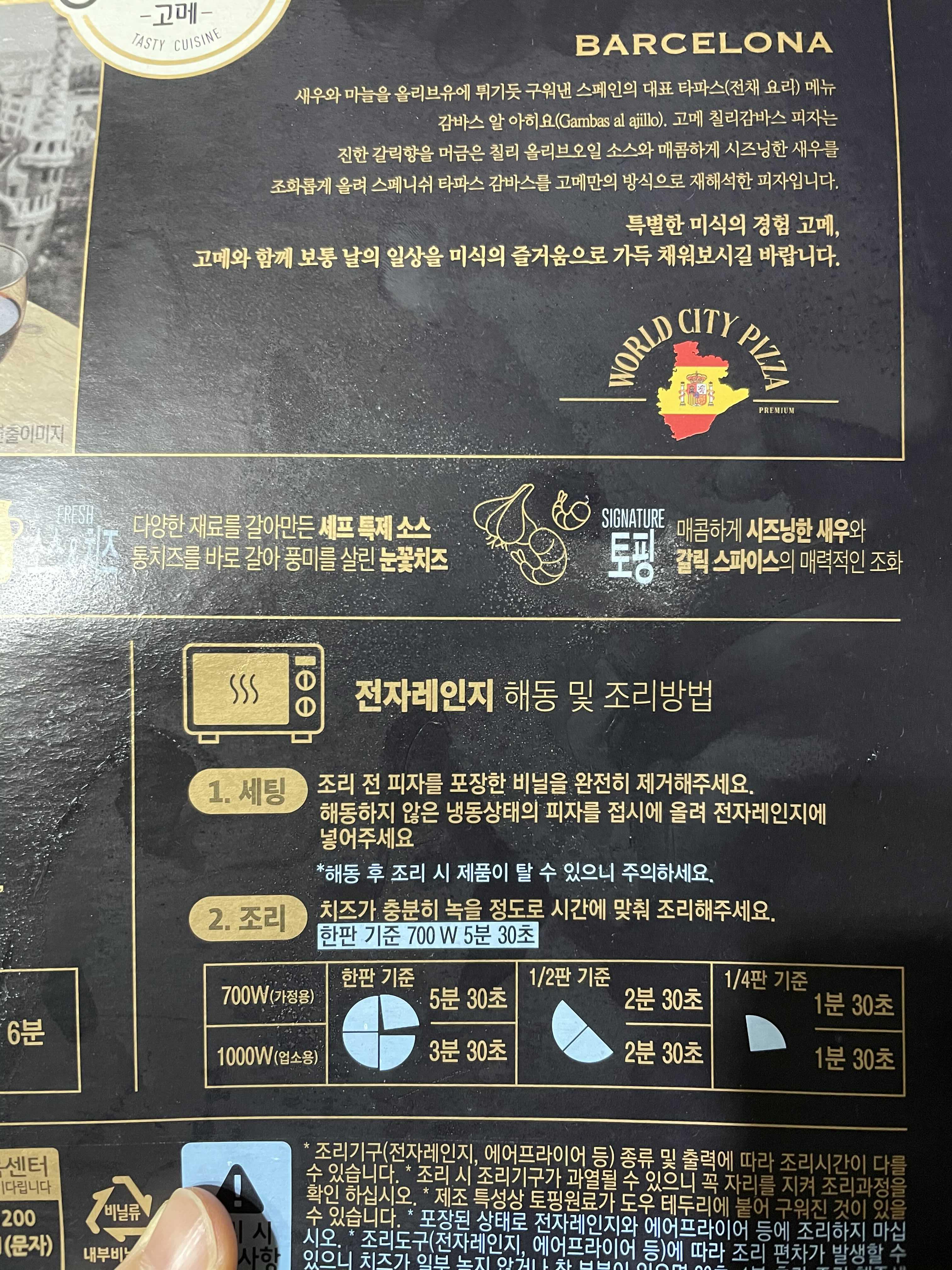 고메 바르셀로나 칠리감바스 피자는 뒷면에 여느 냉동피자가 같이 조리방법이 나와있다.