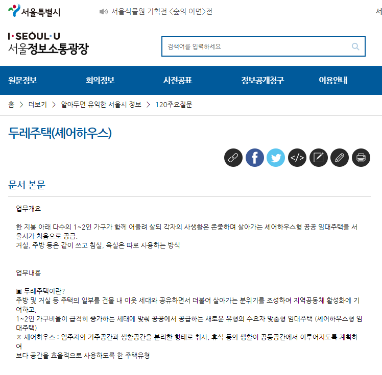 추가로 현재 시행되고 있는 공유주택 등 1인가구를 위한 정책도 짧게 소개하겠다.