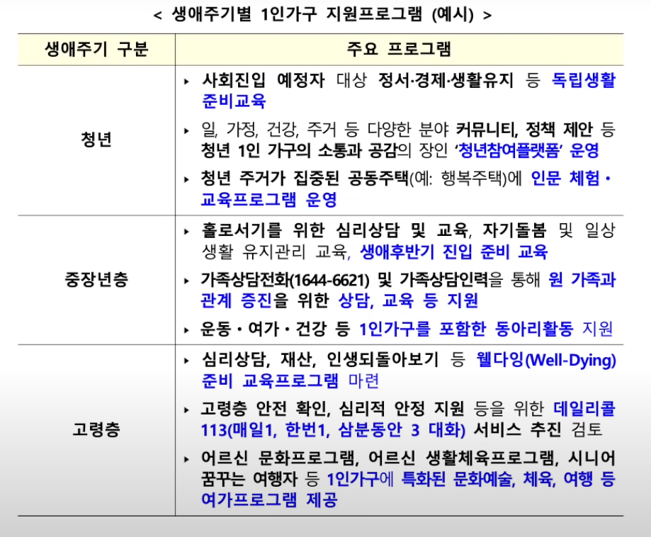 이런 추세에 발맞춰서 정부에서도 복지정책을 기존에 4인가구 중심의 정책에서 1인가구 지원정책을 확대하는 것으로 알려졌다.