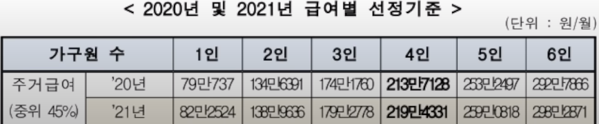 주거급여의 신청자격은 위의 표와 같이 2021년에는 1인가구 기준 월소득 약 82만원, 4인가구 기준 약 220만원 이하의 가구가 해당한다.