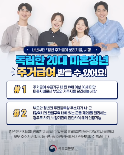 주거급여 수급자 가정의 만 19세 이상 30세 미만의 청년에 해당되며 청년명의로 임대차 계약과 전입신고를 해야한다.