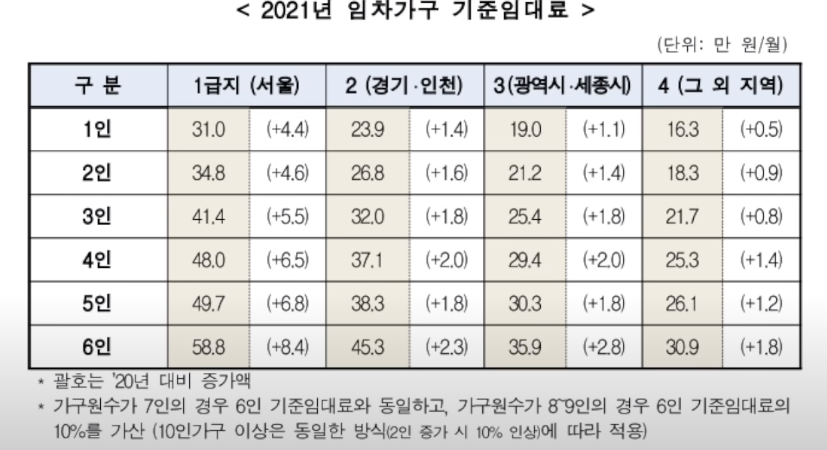 월세로 거주하는 사람들은 아래의 표와 같이 서울의 경우 1인가구 기준 31만원 4인가구 기준 38만원이 지급되며 지역별로 금액은 차이가 있다.