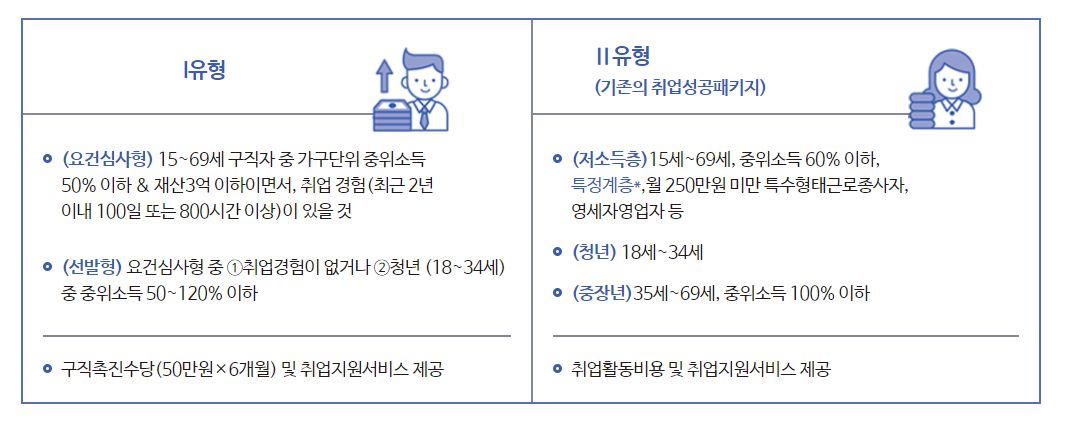 생계지원은 1유형과 2유형에 따라서 1유형은 구직촉진수당을 최대 300만원 지급하며, 2유형은 취업활동 비용으로 최대 265만원까지 지원이 된다는 점을 참고하기 바란다.