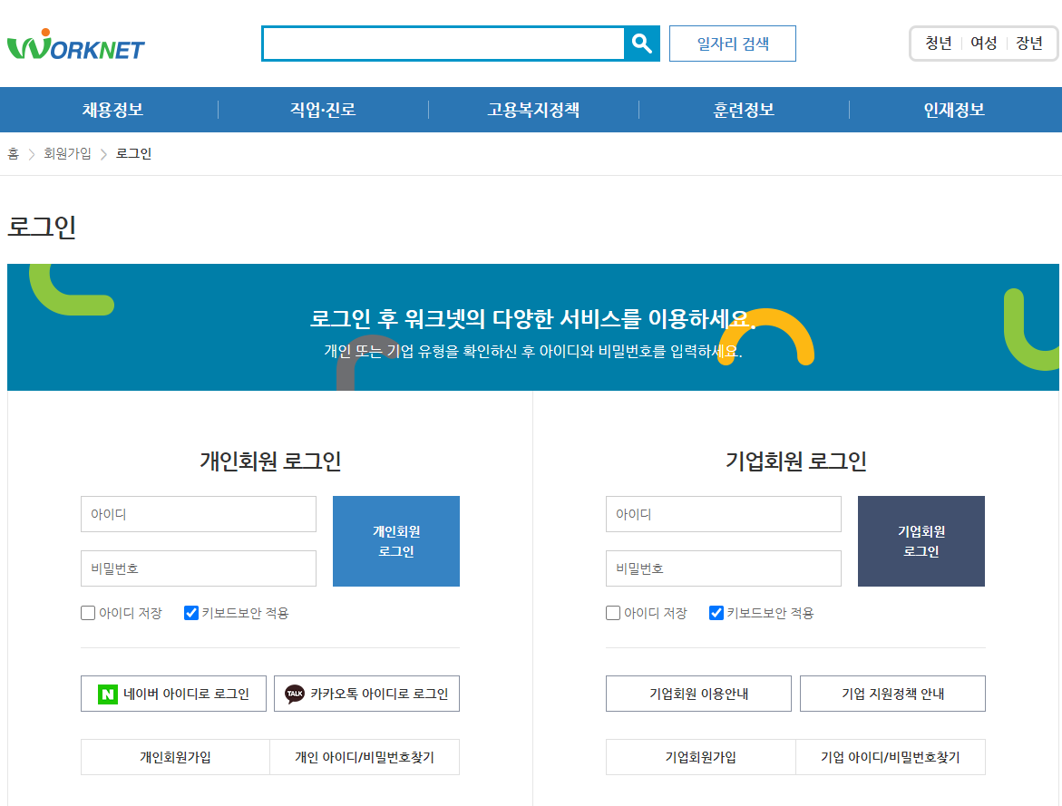 그리고 워크넷 로그인시에 반드시 아이디와 비밀번호가 있어야 한다.