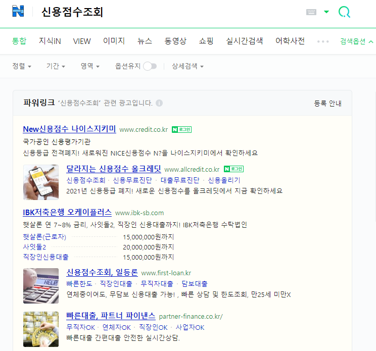 그러면 나이스지키미 혹은 올크레딧이라는 신용정보 사이트가 가장 최상단에 노출될 것이다.