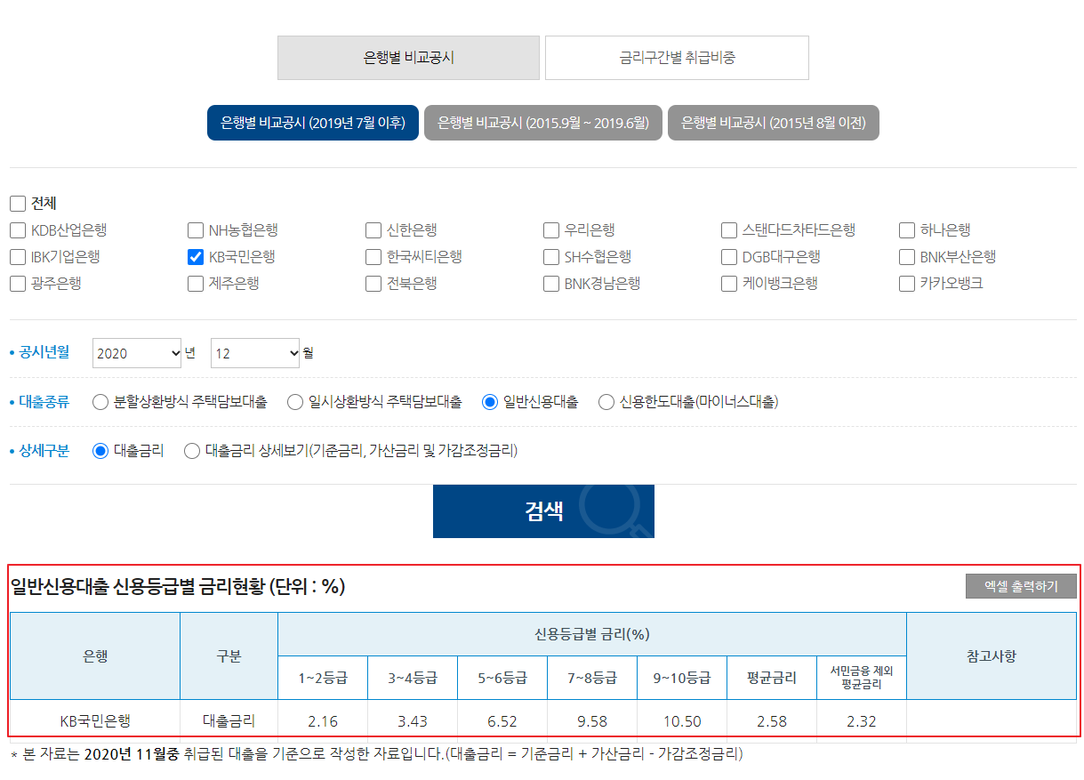 은행연합회 소비자포털에 가면 주요 은행들의 일반 신용대출 금리표를 볼 수 있다.