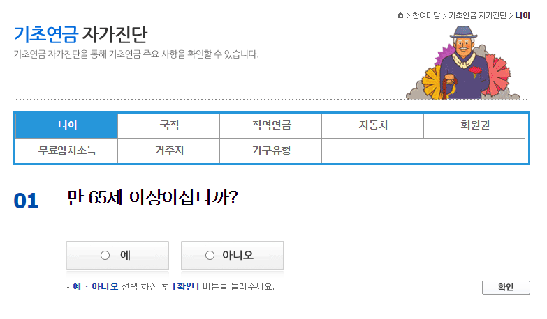 참여마당 > 기초연금 자가진단 > 나이 | 기초연금