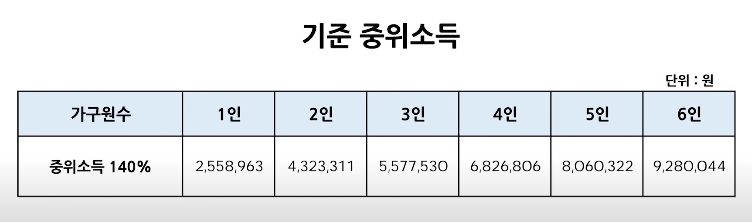 위의 도표처럼 1인일 경우 2,558,963원부터 4인의 경우 6,826,806원 이하의 소득조건을 충족해야만 한다.