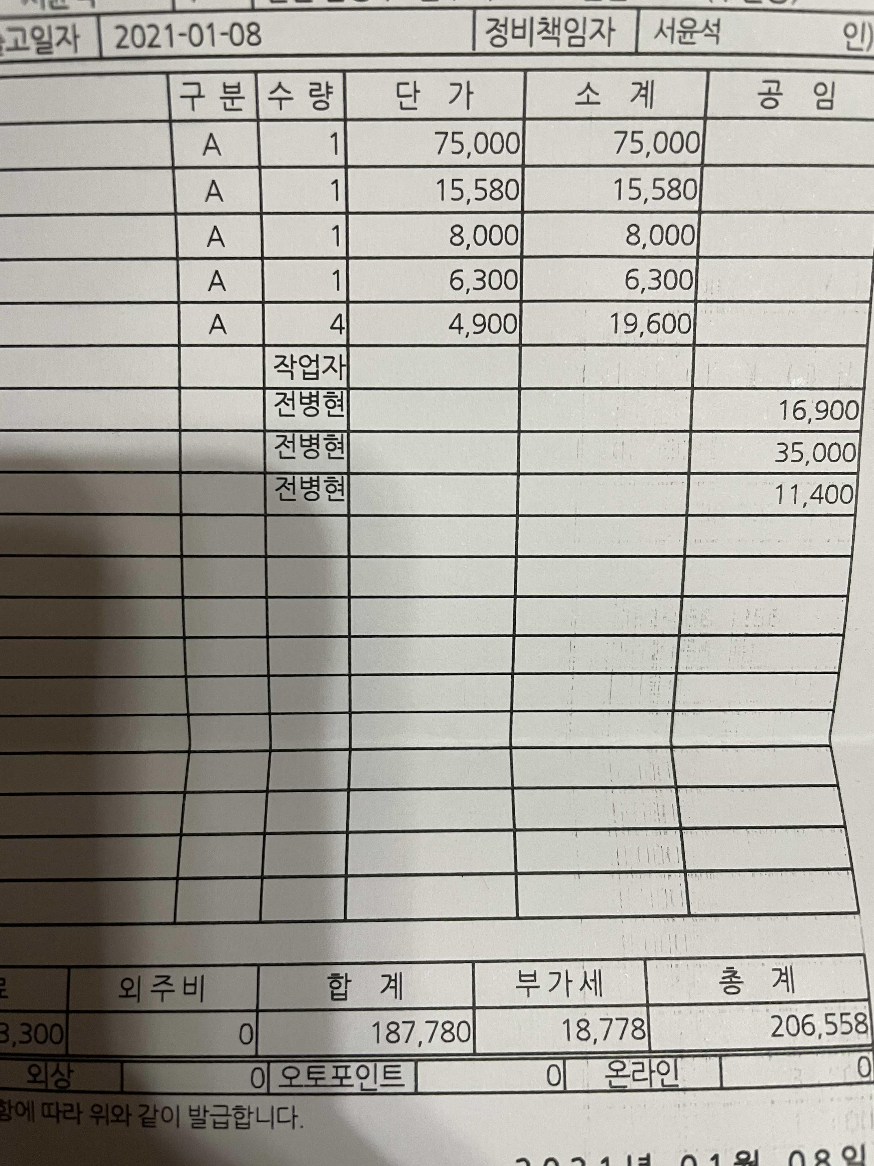 쉐보레 서비스센터에서 배터리, 엔진오일, 브레이크오일 이 세 가지를 교체한 금액이 20만원 정도 나왔다.