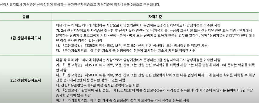 산림치유지도사는 1급과 2급으로 나뉘는데 응시 조건이 간단하지 않다.