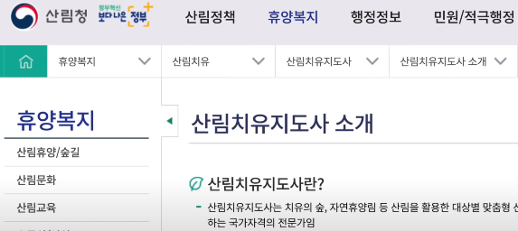 2011년에 국가자격증이 신설되었으며 2014년 학력제한이 폐지되었으며 활동영역이 치유의 숲에서 치유의 숲을 포함한 산림욕장, 자연휴양림, 숲길 등에서 활동이 가능하다.
