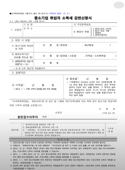 청년소득세 감면신청서 신청을 위해 작성하는 방법