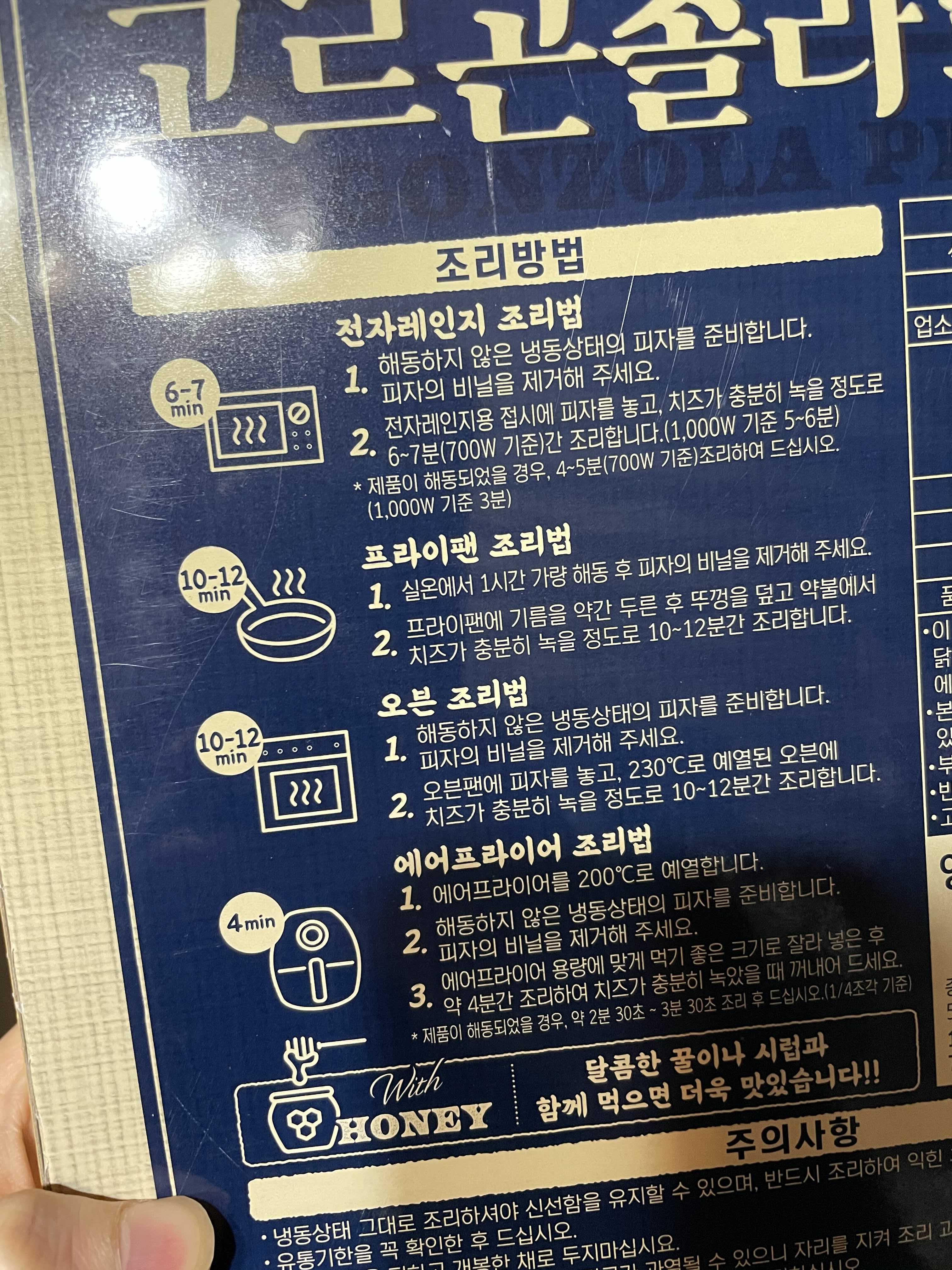 일단 노브랜드 고르곤졸라피자 박스 뒷면에는 여러가지 우리가 알아야 할 사항들이 나와있다.