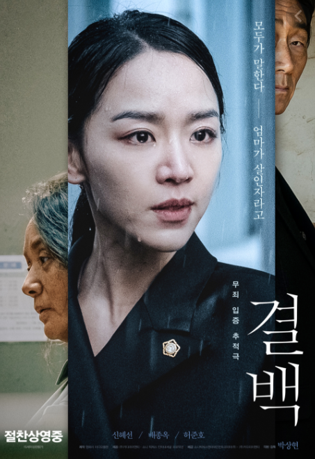 영화 '결백'은 아버지의 장례식장에서 벌어지게 된 막걸리 농약 살인사건, 기억을 잃고 살인사건의 용의자로 몰린 엄마 화자(배종옥)의 결백을 밝히려고 노력하는 변호사 정인(신혜선)이 추시장(허준호)과 마을 사람들이 숨기려고 한 추악한 진실을 파헤치려고 하는 무죄 입증 추적극이다.