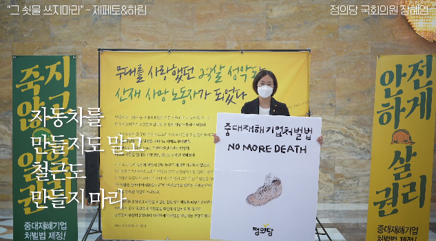 2020년 9월 14일 중대재해기업처벌법 제정 촉구 운동을 위해서 그녀는 국회에서 1인 시위를 했으며, 싱어송라이터의 경험을 살려 산재사고로 사망한 노동자의 이야기가 담겨있는 "그 쇳물 쓰지 마라"를 불러서 화제가 되기도 했다.