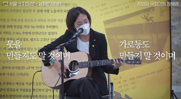 2020년 9월 14일 중대재해기업처벌법 제정 촉구 운동을 위해서 그녀는 국회에서 1인 시위를 했으며, 싱어송라이터의 경험을 살려 산재사고로 사망한 노동자의 이야기가 담겨있는 "그 쇳물 쓰지 마라"를 불러서 화제가 되기도 했다.