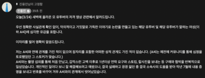 진용진은 자신의 유튜브를 통해서 입장을 밝혔다. 그는 "정확한 사실관계 확인도 없이 악의적이고 거짓말로 가득찬 이야기로 논란을 만들고 있는 해당 유튜버(카광)과 여성에게 심각한 유감을 표한다"라고 적었다.