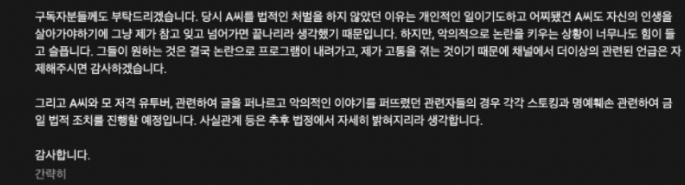 아울러 진용진은 "A씨와 카광과 관련해 글을 퍼나르고 악의적인 이야기를 퍼뜨렸던 관련자들의 경우에는 각각 스토킹과 명예훼손 관련해서 법적 조치를 진행할 예정입니다. 사실관계 등은 추후 법정에서 자세히 밝혀지리라 생각한다"라고 말했다.