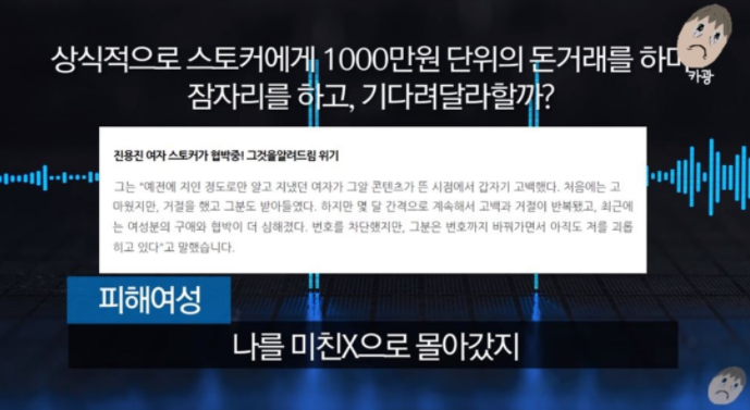 카광이 공개한 진용진의 녹취록에 대해서는 이미 1년이상의 스토킹으로 인해서 극도로 정신이 피폐해졌으며, 정신이 불안한 상태에서 통화를 한 것이라고 말했다.