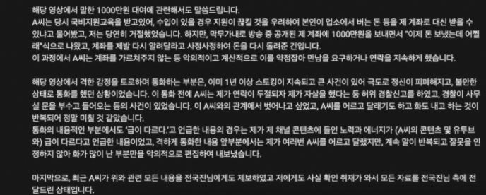 이어서 "이 과정 중에 A씨는 계좌를 가르쳐주지 않는 등의 악의적이며 계산적으로 이를 약점 잡아서 만남을 요구하거나 연락을 지속시켰다."라고 말했다.