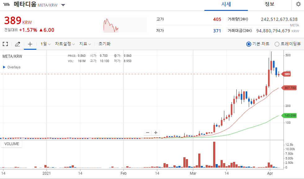 메타디움 코인은 현재 가격이 500원 이상 치솟았다가 389원대에 머무르고 있다. 급하게 상승을 한 코인인 만큼 어느정도의 눌림은 예상했을 거라고 생각한다.