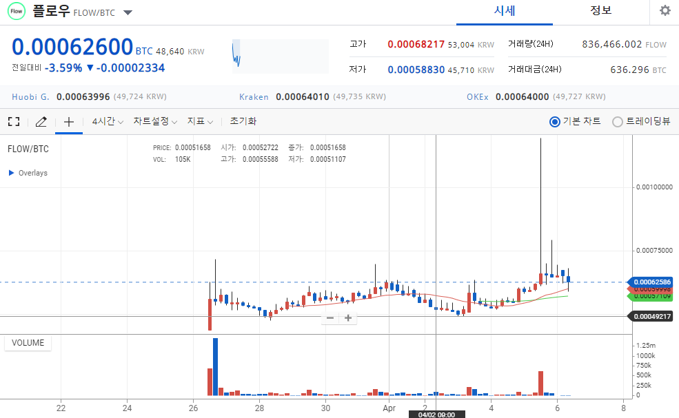 3월 26일 BTC마켓을 시작으로 오늘인 4월 5일 원화마켓에도 플로우가 상장을 하면서 가격이 70,000원대까지 치솟는 기염을 토하기도 했다.
