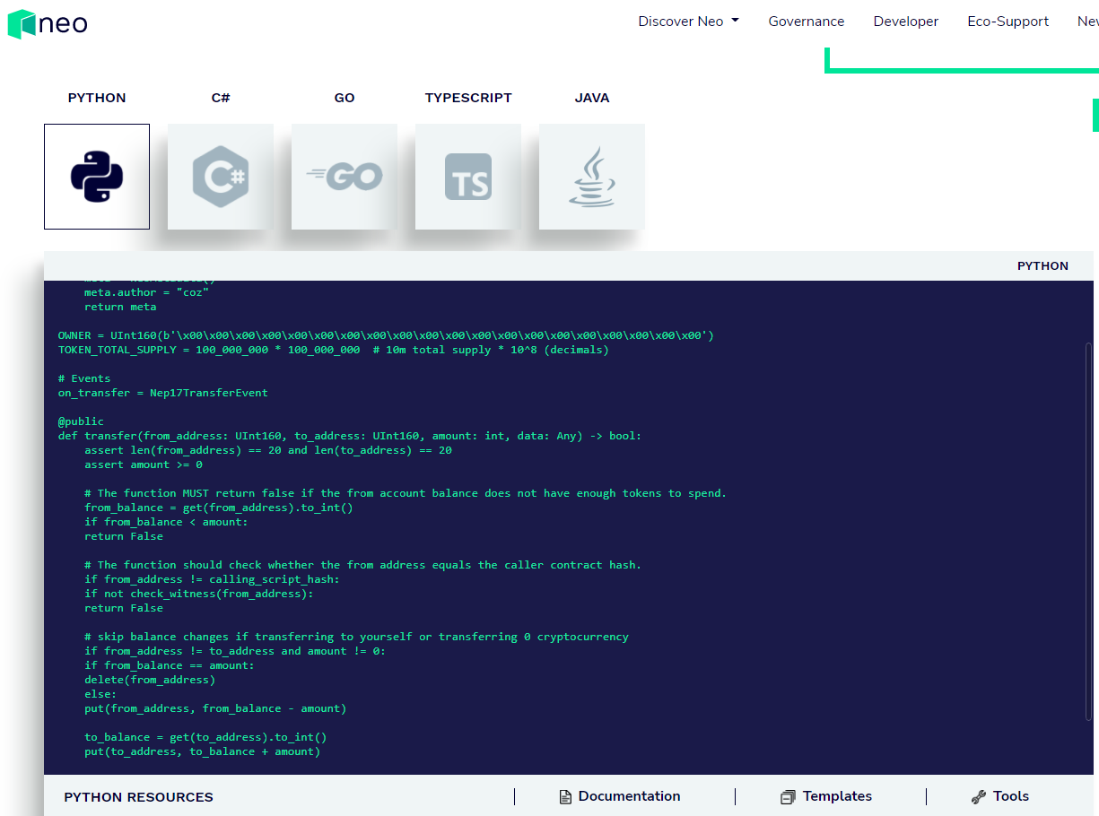 네오는 블록체인 업계 초기에 개발된 코인이라고 하기에는 개발자들에게 높은 접근성을 가지고 있다. 아마 한번쯤 다들 들어봤을만한 'C언어'나 '자바', '파이썬' 언어 등 다양한 프로그래밍 언어를 지원한다. 물론, 최근에 급격하게 부상하는 플랫폼코인들처럼 개발자들이 쉽게 접근할 수 있도록 자체 개발키트나 모듈을 지원하지는 않지만, 14년도에 시작한 프로젝트 치고는 높은 접근성을 보여준다.