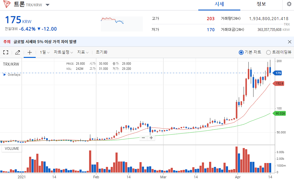 2021년 1분기만에 비트코인은 130%, 이더리움은 220% 상승한 점과 비교해보면 어마어마한 상승률을 보였다고 할 수 있는 트론. 약 600%가 상승했다.