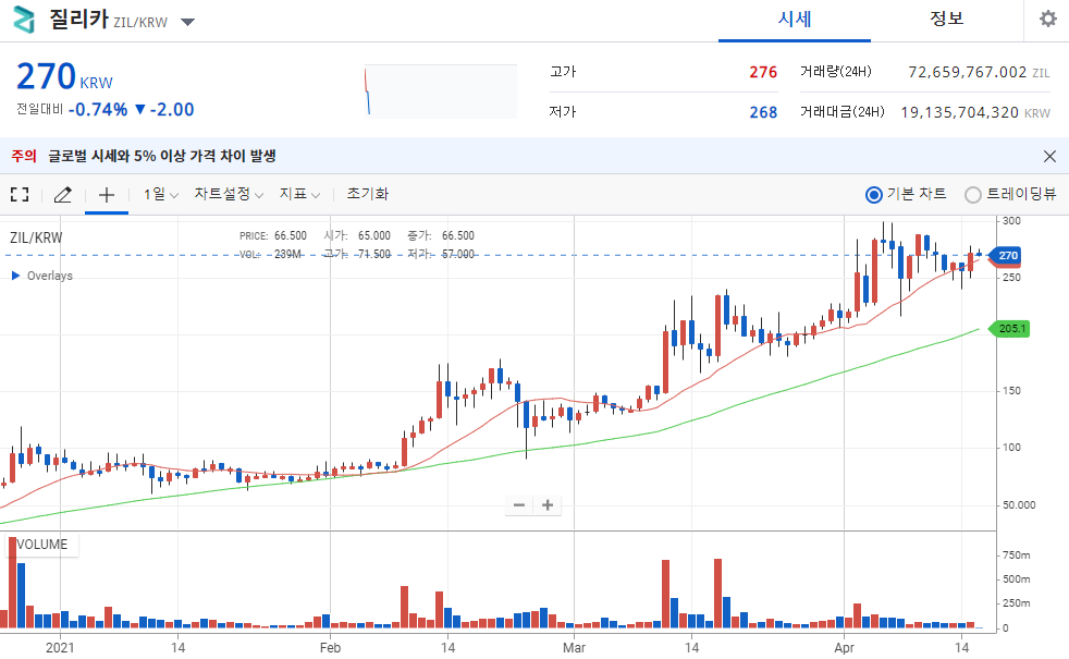 질리카 코인은 작년 말쯤 가격이 50원 아래에서 왔다갔다 했던 코인이다. 하지만 12월 60원을 달성하더니 240원을 넘어서 200원 전후를 유지하고 있다.